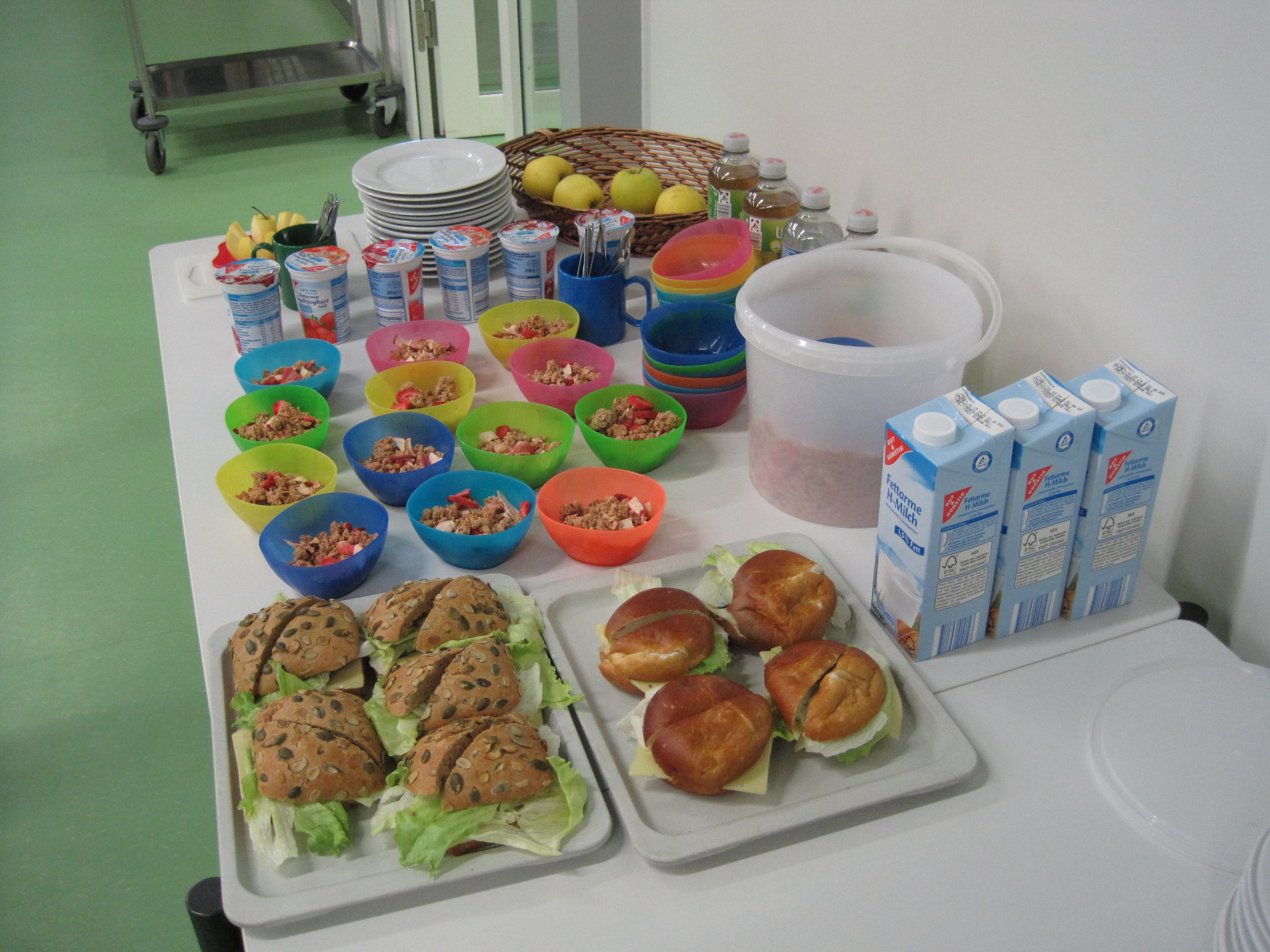 Jeden Dienstag und Donnerstag kommen ca. 40 frohgelaunte Silcherschüler/innen mit der Frage: "Wann gibt es (endlich) Frühstück?" Gleich geht es zum reichhaltigen Frühstücksbuffet mit Müsli, Jogurt, Körnerbrötchen, Brezeln und Äpfeln. Zum Trinken gibt es Apfelschorle, Mineralwasser, Milch und Kakao. In unserer pädagogischen Küche im Bau 5 genießen die Kinder in einer ruhigen, entspannten Atmosphäre mit netten Gesprächen ihr Frühstück. Danke an die Wiedeking-Stiftung, die auch für das Jahr 2017 die Kosten für unser Frühstück übernehmen wird. |